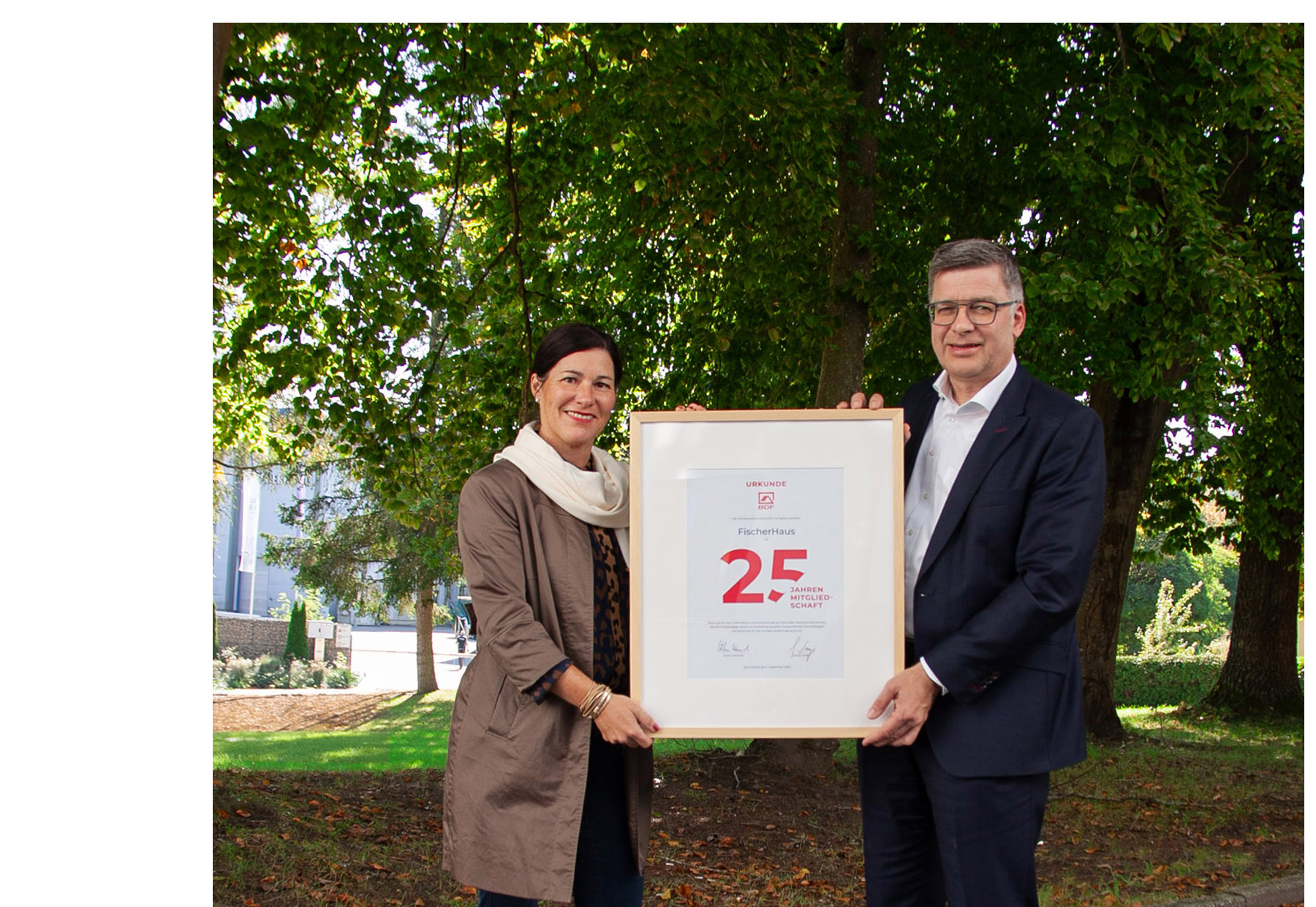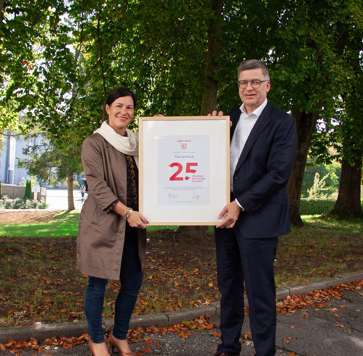 Bad Honnef/Bodenwöhr. Für die 25-jährige Mitgliedschaft im Bundesverband Deutscher Fertigbau (BDF) ist die Holzbau Bayern (vormals FischerHaus) jetzt mit einer Jubiläumsurkunde ausgezeichnet wurden. Bei der Urkundenübergabe an die Holzbau Bayern-Geschäftsführerin Barbara Fuchs lobte BDF-Geschäftsführer Georg Lange den Qualitätsanspruch des Familienunternehmens: „Jeder Hersteller unseres Verbandes verpflichtet sich zur Einhaltung der umfassendsten Qualitätskriterien für den Hausbau. So profitieren etwa FischerHaus-Bauherren von Bau- und Servicequalität und leisten überdies wertvolle Beiträge zur Nachhaltigkeit und Ressourceneffizienz. Dafür steht das QDF-Siegel unserer Qualitätsgemeinschaft Deutscher Fertigbau“, so Lange.