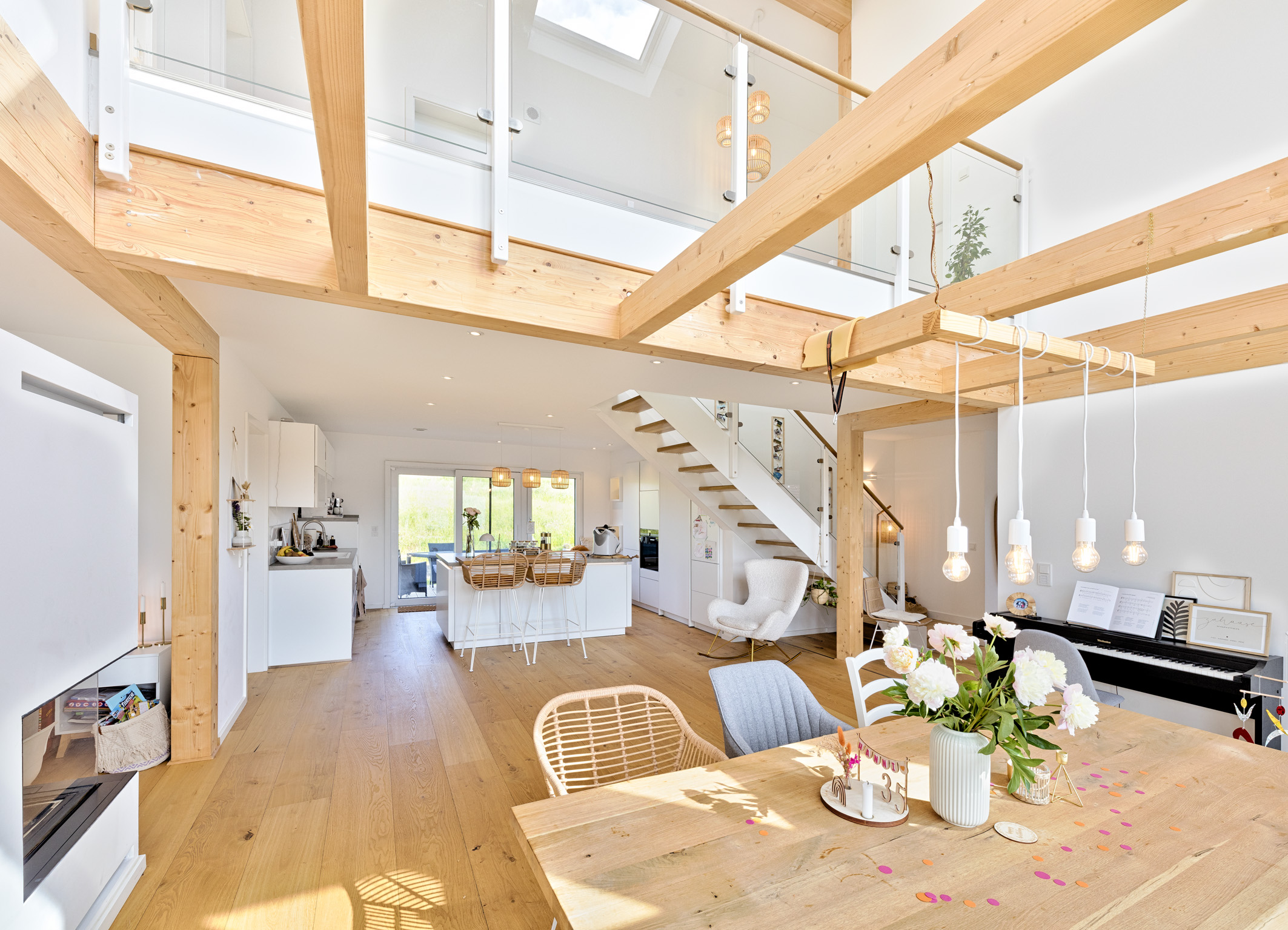 Die im Fertigbau eingesetzte Holzbauweise sorgt gemeinsam mit einer durchdachten Planung für ein natürliches angenehmes Raumklima und spürbare Wohnqualität. Funktionale Grundrisse, klare Rückzugsorte nach persönlichem Gusto und Räume für gemeinsames Leben fügen sich zu einem Zuhause, das Komfort, Gesundheit und Lebensqualität gekonnt verbindet.