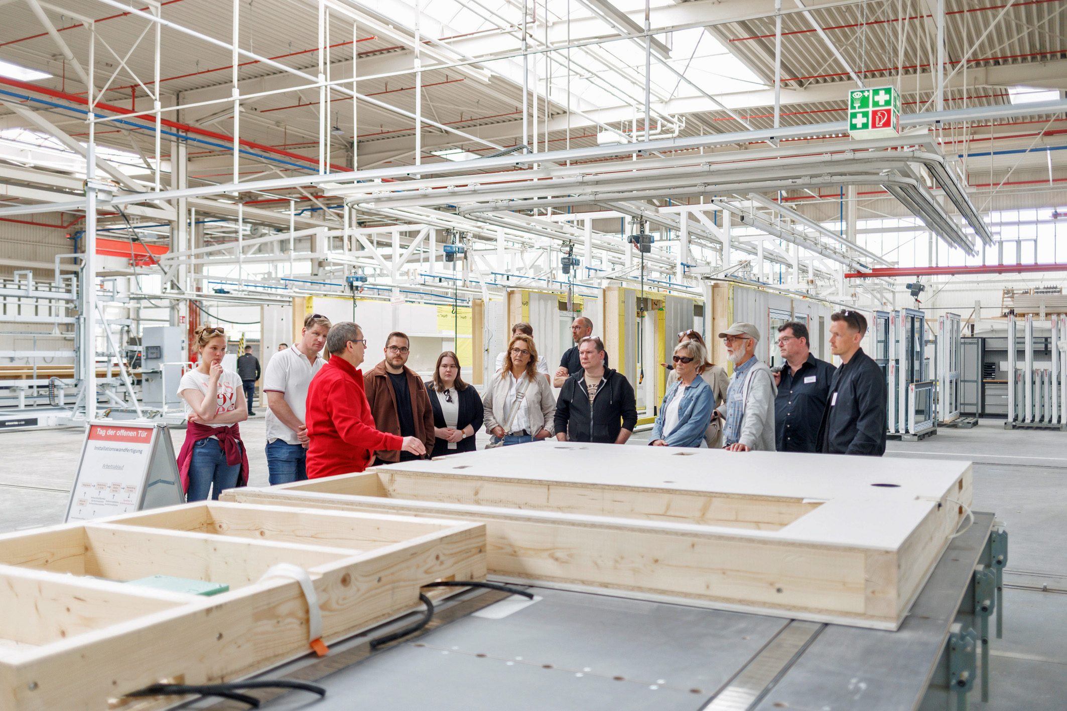 Bild 1: Wie entsteht ein Fertighaus? Antworten erhielten die Teilnehmenden der Werksführungen am „Tag des deutschen Fertigbaus“. Foto: BDF/WeberHaus